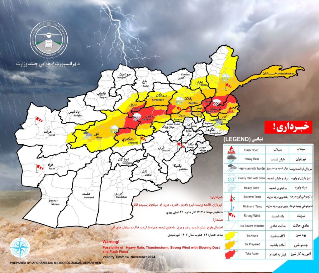 به گفته اداره هواشناسی حکومت سرپرست در جریان این دو روز، احتمال سرازیر شدن سیلاب ناشی از بارندگی، و آب شدن برف با بلند شدن سطح آب در مسیر دریاهای بادغیس، غور،هرات، فراه، دایکندی، غزنی، پنجشیر، غوربند، کنر، لغمان، لوگر، میدان وردک، پکتیا، خوست، پکتیکا، جوزجان، فاریاب، سرپل، بلخ، سمنگان، بغلان، تالقان، فیض آباد وبعضی سیلبرهای مربوطه پیش بینی می شود.
