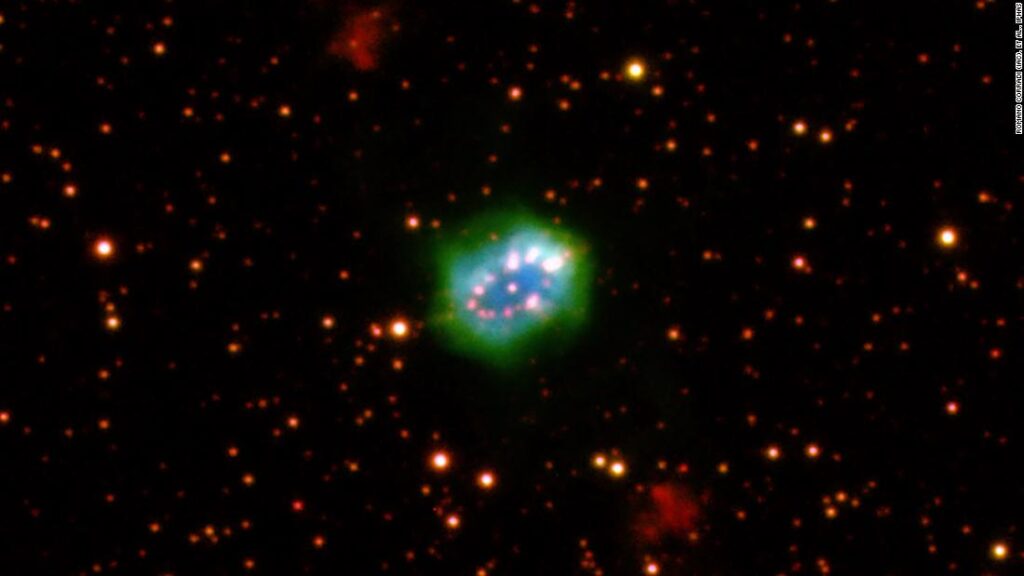 اين تصوير که توسط «تلسکوپ خيلي بزرگ» متعلق به «رصدخانه جنوبي اروپا» در شيلي رصد شده است، يک ابر سبزرنگ درخشان از گاز موسوم به «سحابي سياره‌اي» را نمايش مي‌دهد.