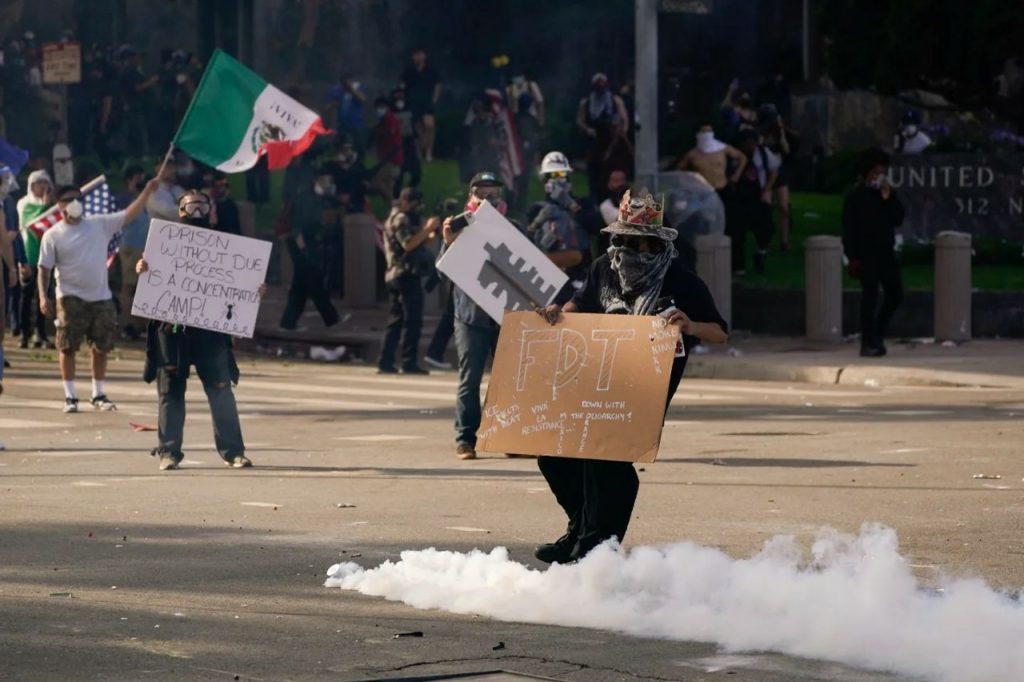 در لسآنجلس، مأموران برای متفرق کردن جمعیت در نزدیکی ساختمان فدرال مرکز شهر ـ که هفته گذشته محل اعتراضات ضد اداره مهاجرت (ICE) بوده ـ از گاز اشکآور استفاده کردند.