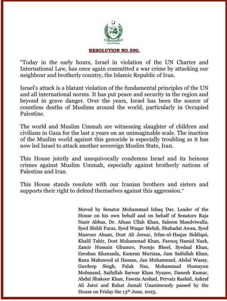 خبرگزاری دید: مجلس سنای پاکستان روز جمعه قطعنامهای را با اتفاق آراء تصویب کرد که در آن حملات اخیر رژیم اسرائیل علیه ایران را محکوم کرده و آن را نقض اصول منشور سازمان ملل و قوانین بینالملل دانست.