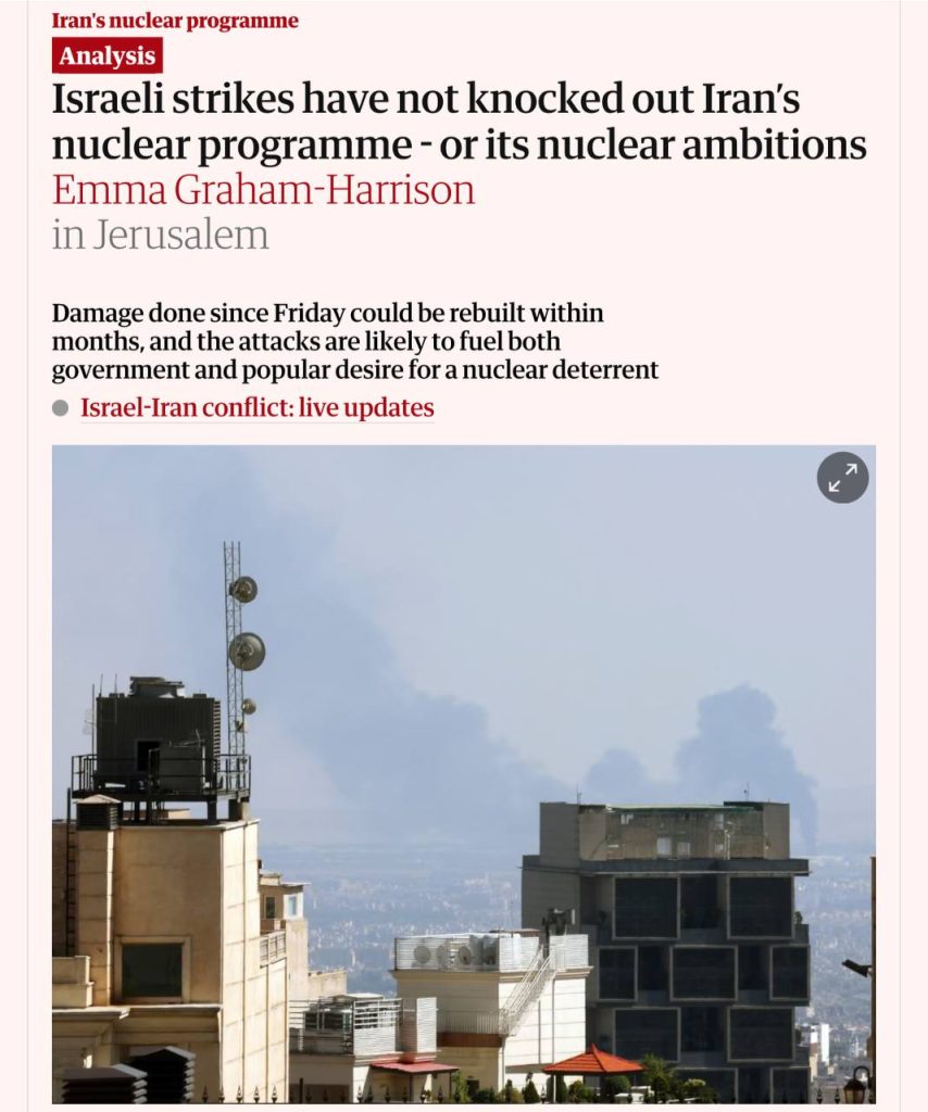 بر پایه گزارش گاردین، تحلیلگران مستقل در حوزه اشاعه هستهای و نیز فرماندهان نظامی اسرائیل بهطور مشترک باور دارند که ضربههای واردشده، بیشتر نمایشی از قدرت اطلاعاتی و نظامی بوده تا اقدامی سرنوشتساز در توقف واقعی برنامه هستهای ایران.