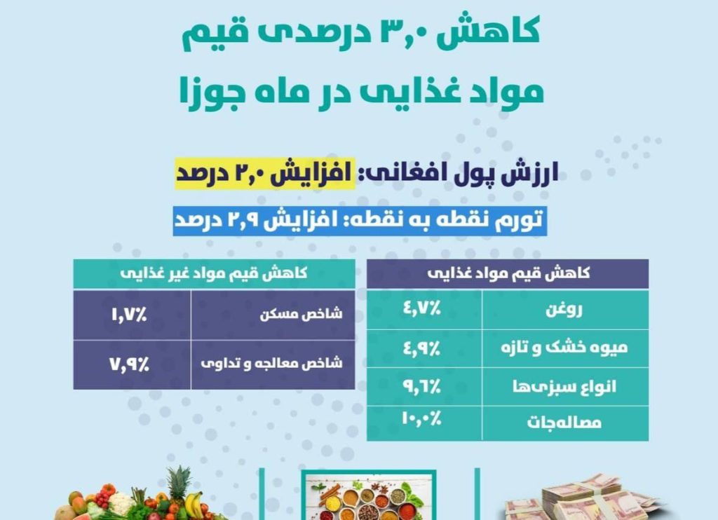 اداره ملی احصائیه و معلومات اعلام کرد که قیمت مواد غذایی در ماه جوزای سال جاری نسبت به ماه گذشته سه درصد کاهش یافته است.