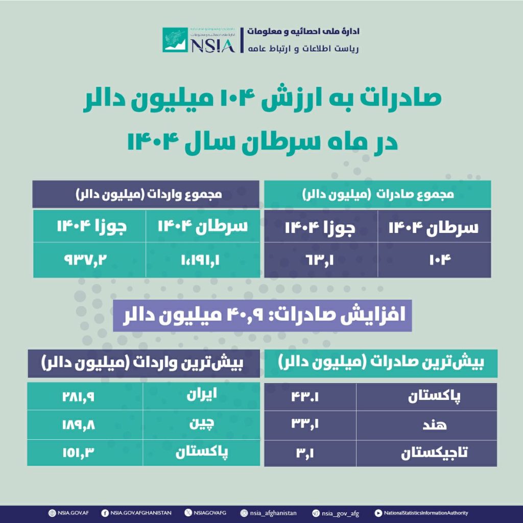 خبرگزاری دید: اداره ملی احصائیه و معلومات حکومت سرپرست اعلام کرد که ارزش صادرات کشور در ماه سرطان سال ۱۴۰۴ به ۱۰۴ میلیون دالر رسیده است، در حالی ‌که این رقم در ماه جوزای همین سال فقط ۶۳٫۱ میلیون دالر بود.