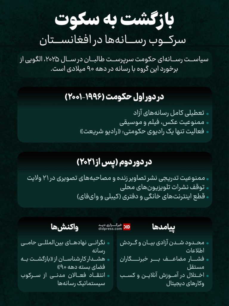۴:۰۵ ب.ظ ۲۵ سنبله ۱۴۰۴۰ 1 کمتر از یک دقیقه اینفوگرافیک بازگشت به سکوت؛ سرکوب رسانهها در افغانستان ۴:۰۵ ب.ظ ۲۵ سنبله ۱۴۰۴۰ 1 کمتر از یک دقیقه اشتراک گذاری فیس بوک X پیام رسان پیام رسان واتس آپ تلگرام اشتراک گذاری از طریق ایمیل چاپ