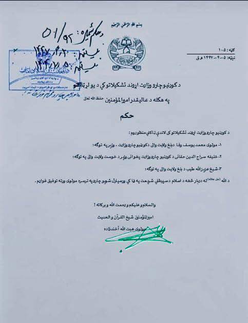 همچنین مولوی محمد یوسف وفا والی حکومتسرپرست در بلخ، جانشین سراجالدین حقانی در وزارت داخله تعیین شده است.