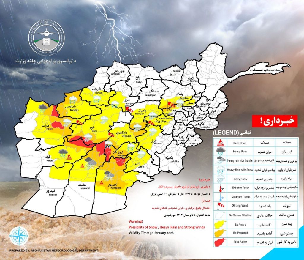 خبرگزاری دید: ریاست هواشناسی وزارت ترانسپورت و هوانوردی طالبان اعلام کرده که فردا، جمعه ۱۰ دلو، بارشهای سنگین برف و باران در ۱۸ ولایت کشور پیشبینی میشود.