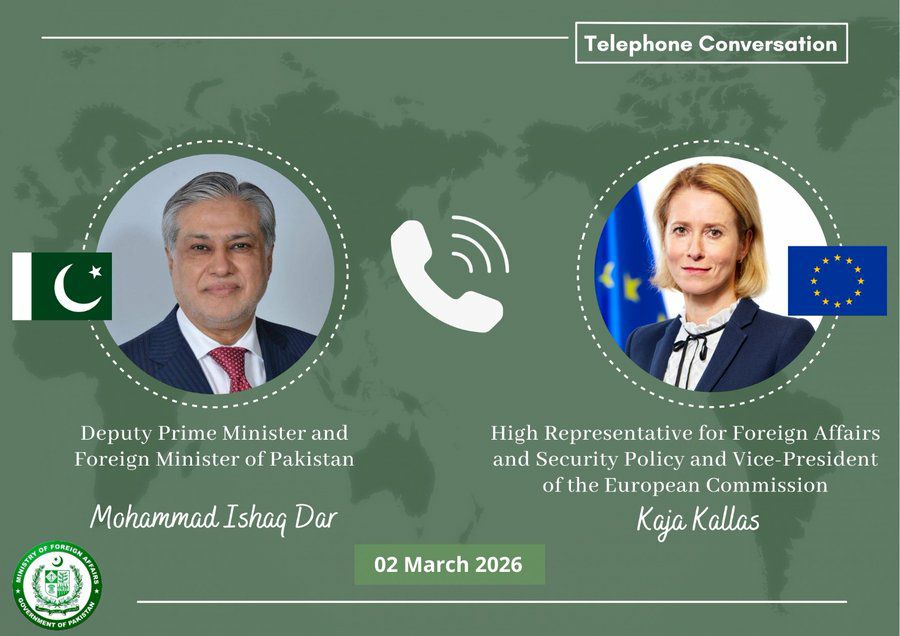 خبرگزاری دید: اسحاق دار، معاون نخستوزیر و وزیر امور خارجه پاکستان، روز دوشنبه در گفتوگوی تلفنی با کایا کالاس، مسوول سیاست خارجی اتحادیه اروپا، درباره تحولات اخیر منطقهای رایزنی کرد.