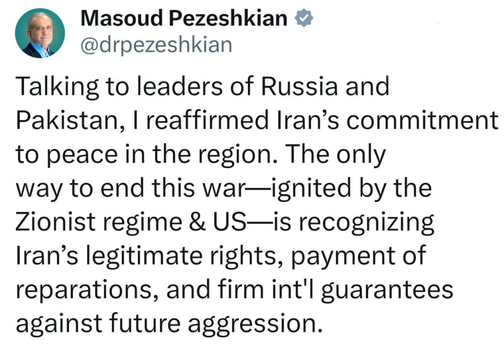 مسعود پزشکیان ، رئیسجمهور ایران، در پیامی در شبکه اجتماعی ایکس نوشت که در گفتوگو با رهبران روسیه و پاکستان بار دیگر بر تعهد کشورش به صلح و ثبات در منطقه تأکید کرده است.