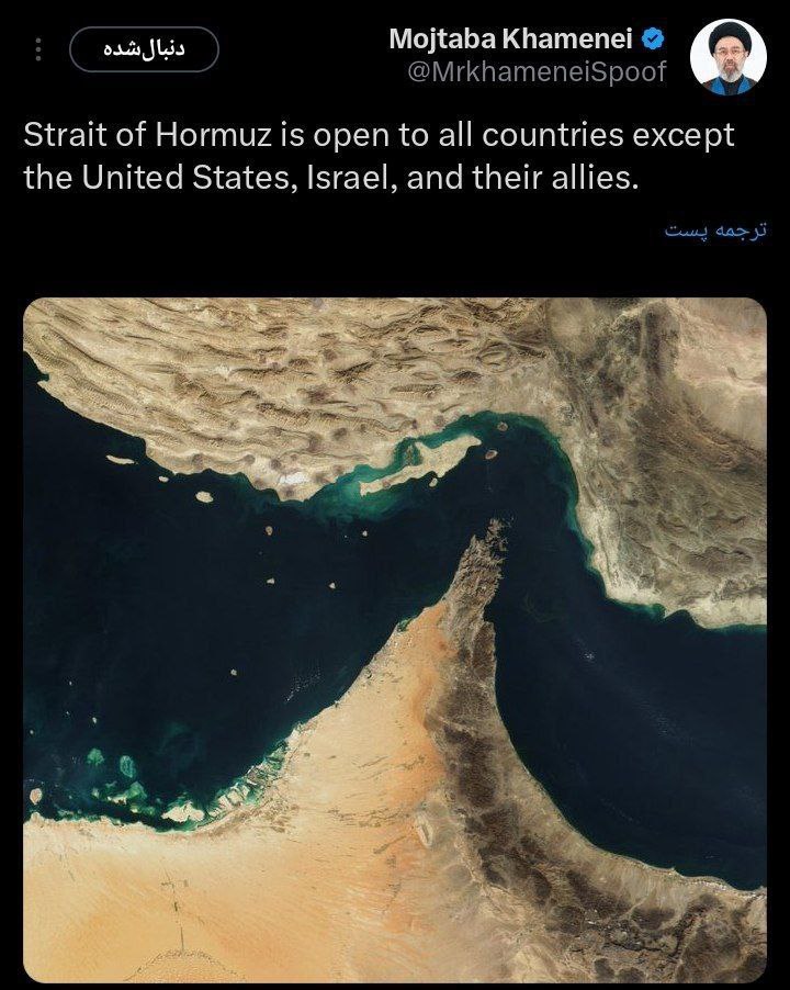 خبرگزاری دید: آیت‌الله سید مجتبی خامنه‌ای، سومین رهبر جمهوری اسلامی ایران، اعلام کرده که تنگه هرمز برای عبور کشتی‌های تمامی کشورها باز خواهد بود، اما ایالات متحده آمریکا، اسرائیل و متحدان آن‌ها از این قاعده مستثنا هستند.