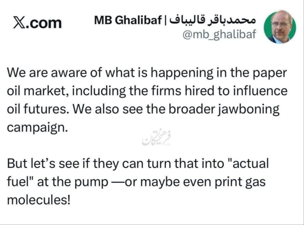 خبرگزاری دید: رئیس مجلس شورای اسلامی ایران با انتشار پیامی در شبکه اجتماعی ایکس، به تحرکات اخیر در بازار جهانی نفت واکنش نشان داد و با لحنی کنایهآمیز، کارایی «نفت کاغذی» در تأمین واقعی انرژی را زیر سؤال برد.