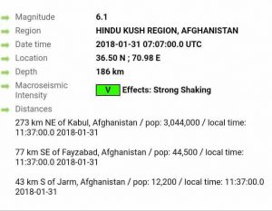 حوالی نزدیک ظهر امروز زمینلرزهای در مقیاس ۶٫۱ ریشتر مناطق مرکزی و شمالشرقی کشور را لرزاند و دامنههای آن تا مناطقی در پاکستان و هند نیز احساس شد.
