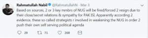 به گزارش خبرگزاری دید، آقای نبیل در توئیتر خود نوشت: براساس برخی منابع، دست کم سه نفر از اعضای کلیدی حکومت وحدت ملی به دلیل داشتن روابط نزدیک و مخفیانه با سازمان اطلاعات ارتش پاکستان یا اخراج و یا مجبور به استعفا خواهند شد.