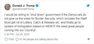 دونالد ترامپ رییس جمهور امریکا با انتشار توییتی تهدید کرد که اگر دموکراتها به طرح تامین بودجه امنیت مرزی از جمله کشیدن دیوار در مرز با مکسیکو رای ندهند، دولت را تعطیل خواهد کرد.