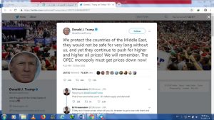 آقای ترامپ خطاب به رهبران کشورهای عرب خاورمیانه در توییتر نوشت: دوام پادشاهی شما منوط به حمایت امریکا است. ای دست نشانده های ما، فوراً قیمت نفت را پایین بیاورید.
