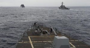 روز یکشنبه چارلز برائون سخنگوی ناوگان اقیانوس آرام نیروی دریایی امریکا اطلاع داد که کشتی جنگی چین از فاصله «خطرناکی» از نزدیکی کشتی جنگی امریکا عبور کرد که مشغول عملیات تأمین ناوبری آزاد در نزدیکی جزایر مورد اختلاف در دریای چین جنوبی بود.