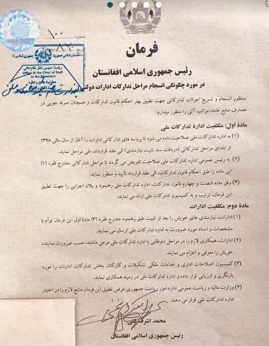 در این فرمان آمده است که تمام ادارات دولتی لایحه تدارکاتی خویش را برای اجرایی شدن به اداره تدارکات ملی میسپارند.