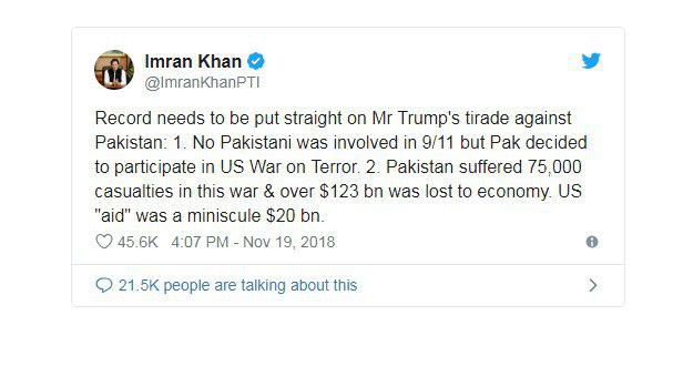 عمران خان در ادامه پیام توییتری خود افزوده است: جنگ با تروریزم برای پاکستان بیش از ۱۲۳ میلیارد دالر هزینه داشت در حالی که امریکا تنها ۲۰ میلیارد دالر کمک کرده است.