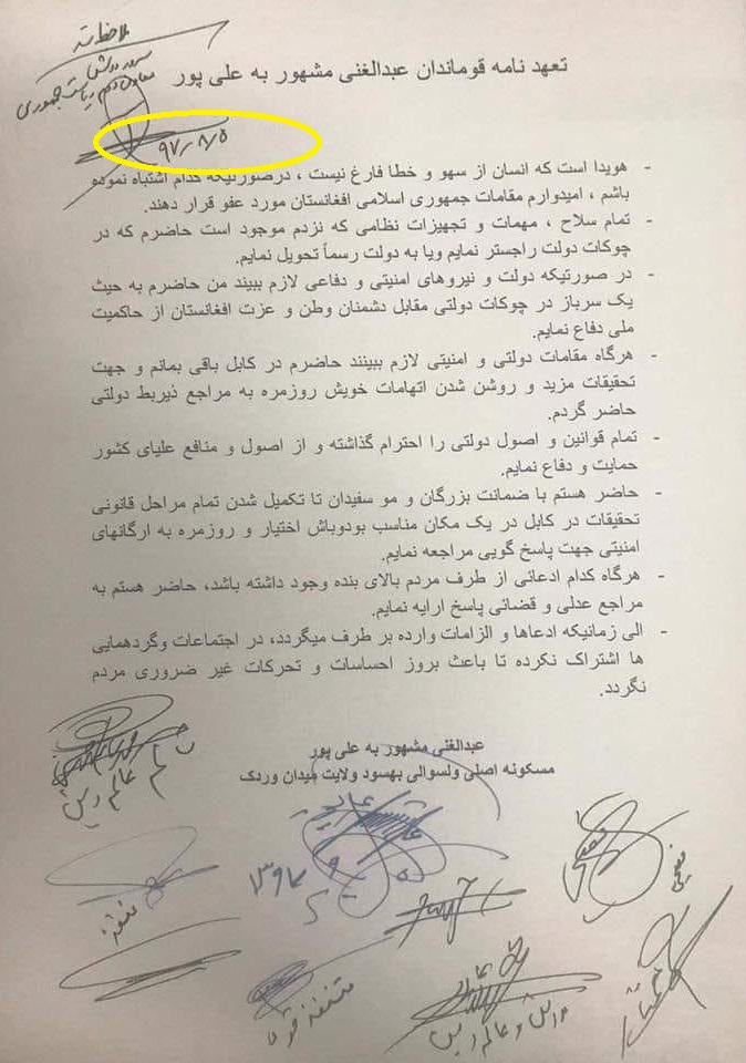 گذشته از این که در تعهدنامه به چه نکاتی پرداخته شده و چقدر می‌تواند فرماندهان همانند علی‌پور را از عصبیت و عصیانگری علیه نظامی که متهم به انحصار، استبداد و قوم‌گرایی باز می‌دارد، یک نکته خیلی قابل توجه است و آن این که تاریخ امضای محمد سرور دانش در بالای برگه تعهد بر می‌گردد به یک ماه پیش.