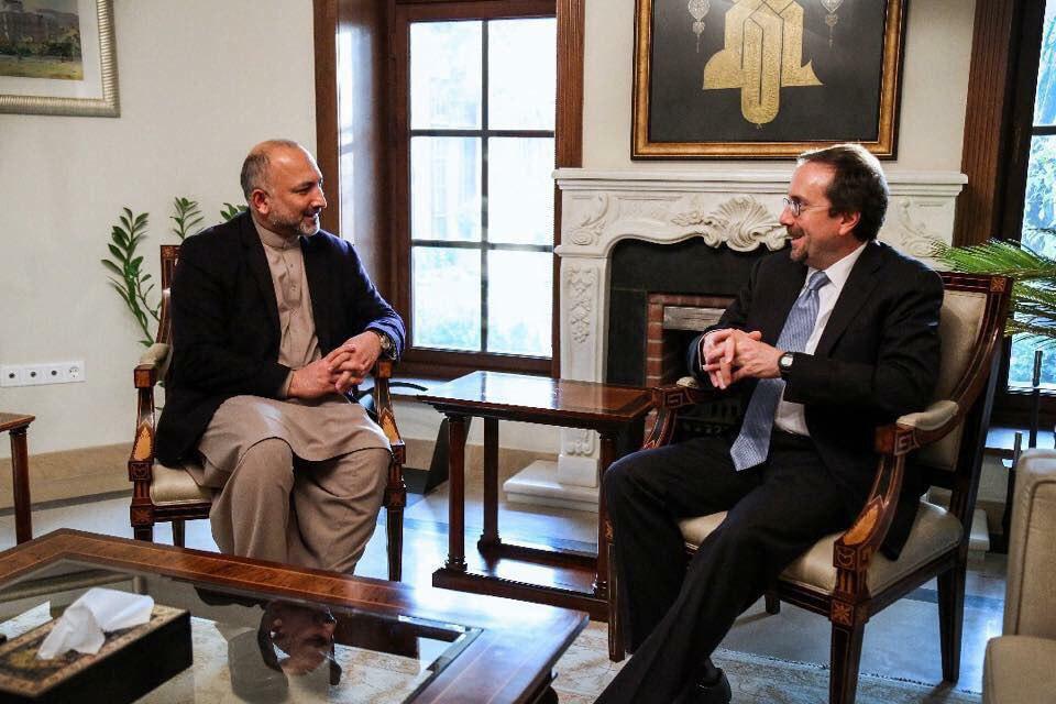 گزارشهای حاکی است که محمد حنیف اتمر مشاور پیشین شورای امنیت ملی با جان آر باس سفیر ایالات متحده در افغانستان دیدار کرده و روی گفتوگوهای صلح، انتخابات اینده ریاست جمهوری و حمایت جامعه جهانی از آن تاکید کرد.