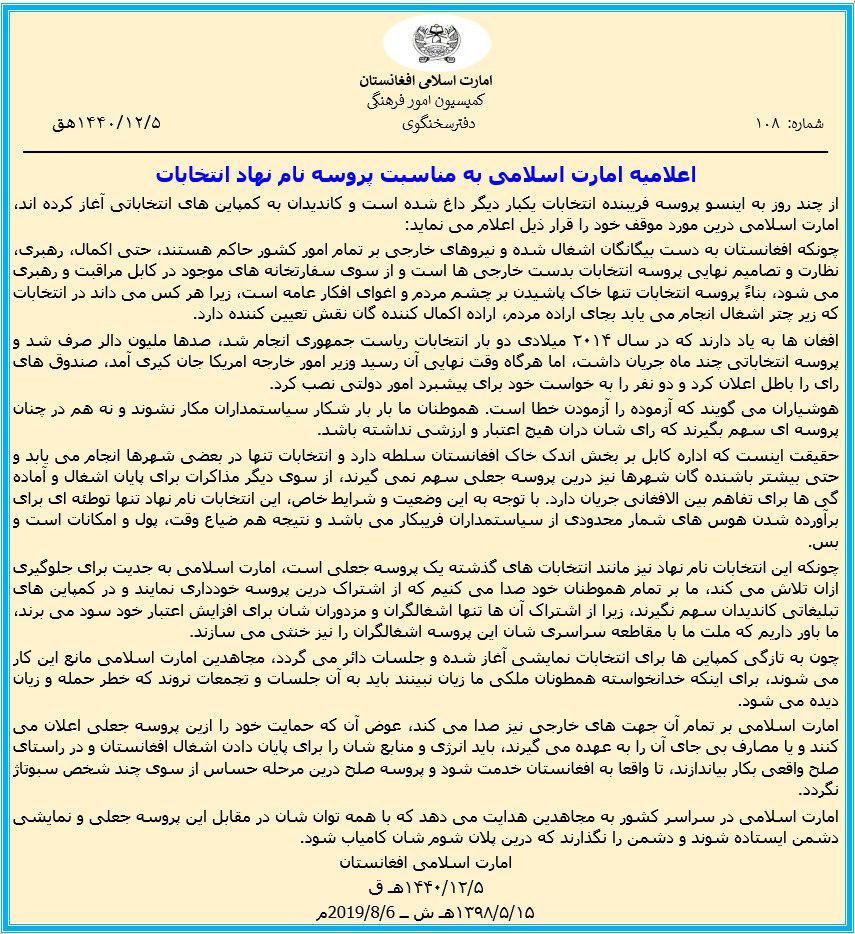 در اعلامیه آمده است:« چون به تازگی کمپاین‌ها برای انتخابات نمایشی آغاز شده و جلسات دائر می‌گردد، مجاهدین امارت اسلامی مانع این کار می‌شوند، برای این که خدانخواسته هموطنان ملکی ما زیان نبینند باید به آن جلسات و تجمعات نروند که خطر حمله و زیان دیده می‌شود.»