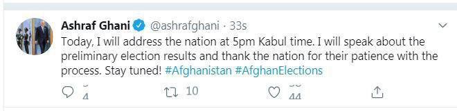 به گزارش خبرگزاری دید، محمد اشرف غنی در توییتی که لحظات قبل منتظر کرد، ضمن تشکر از حوصله مندی مردم نسبت به تاخیر در اعلام نتایج، خبر داد که شام امروز به وقت کابل در باره نتایج ابتدایی انتخابات صحبت خواهد کرد.