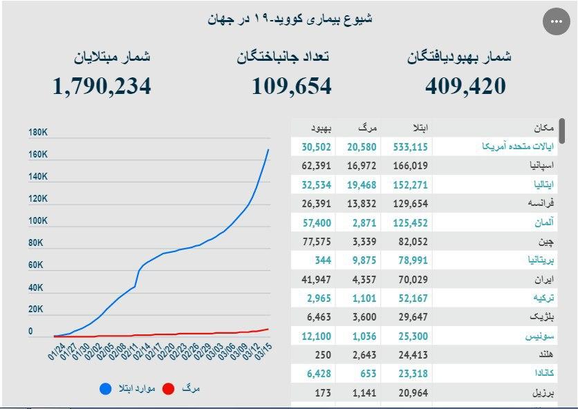بیماری همهگیر کووید- ۱۹ تاکنون جان بیش از ۱۰۸ هزار نفر را در جهان گرفته و بیش از یک میلیون و ۸۰۰ هزار نفر نیز تا صبح روز یکشنبه ۲۴ حمل ۱۳۹۹ به ویروس کرونا مبتلا شدهاند.