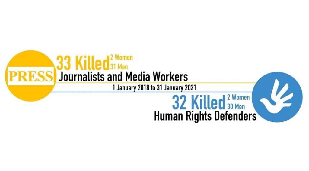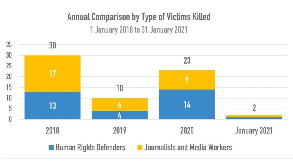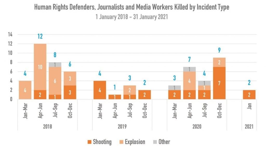 این گزارش تعداد مجموعی ۶۵ کشته از مدافعین حقوق بشر و متخصصین رسانهای را از اول جنوری ۲۰۱۸ تا ۳۱ جنوری ۲۰۲۱ ثبت نموده است که از این تعداد ۳۲ تن از حوزه حقوق بشر و ۳۳ تن از بخش رسانهها میباشند.