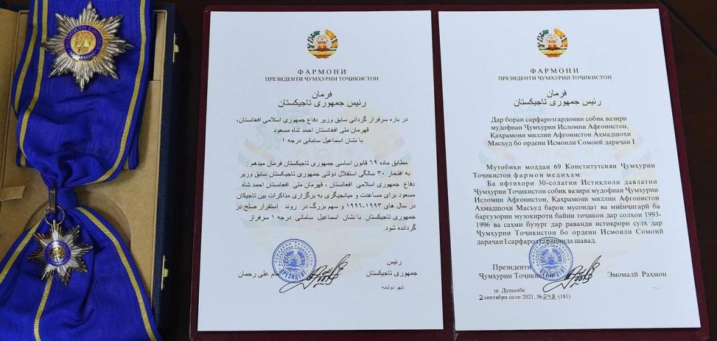 رییس جمهور تاجیکستان امام علی رحمان، در فرمانی به مناسبت سیامین سالگرد استقلال کشورش، برای احمد شاه مسعود وزیر دفاع دولت اسلامی و قهرمان ملی کشور، نشان درجه یک اسماعیل سامانی را اعطا کرد.