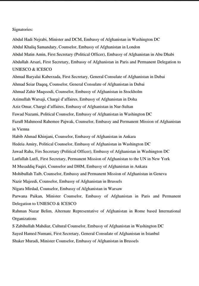 شماری از دیپلماتهای کشور با امضای بیانیه مشترک، نگرانی شان را از اوضاع جاری در افغانستان ابراز داشته و با مخاطب قرار دادن جامعه بینالمللی تقاضاهای شان را ابراز داشتهاند.